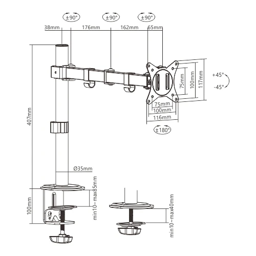 - Sugerowana grubość biurka: Zacisk: 10 ~ 85 mm Przelotka: 10 ~ 40 mm