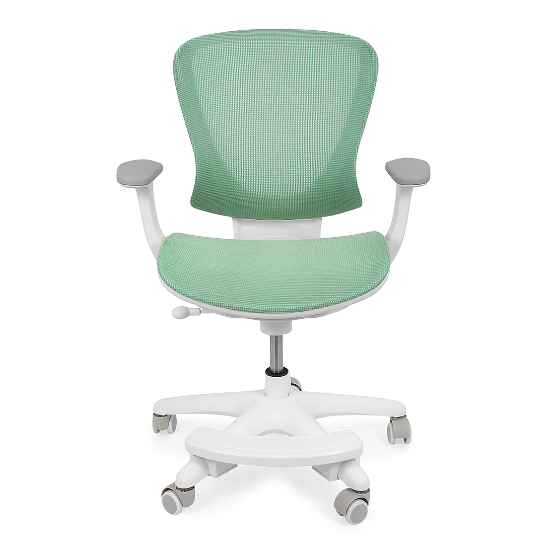 Stylowe krzesło obrotowe dla dziecka w kolorze zielonym, który idealnie wpasuje się w aranżację pokoju dziecięcego. Przeznaczony dla dzieci od 5-14 lat. Ergonomiczne kształty oparcia i siedziska dbają o zdrowie kręgosłupa pociechy podczas nauki przy biurku. Mechanizm blokady kółek sprawia, że dziecko będzie siedzieć wygodnie, bez niekontrolowanego przemieszczania się przy biurku, dzięki czemu łatwiej będzie skupić się na nauce. Wystarczy, że usiądzie na krześle, a ono nie przemieści się.