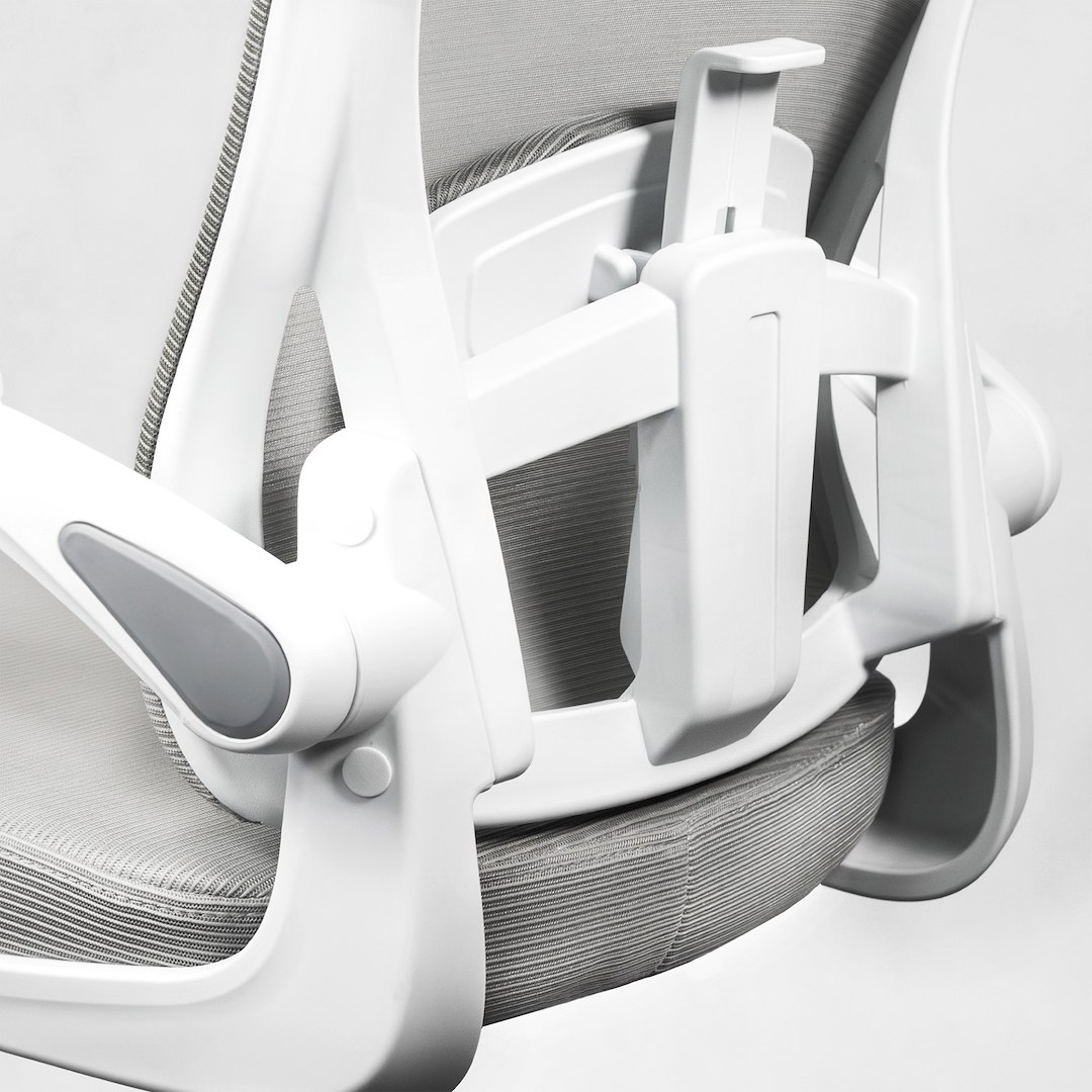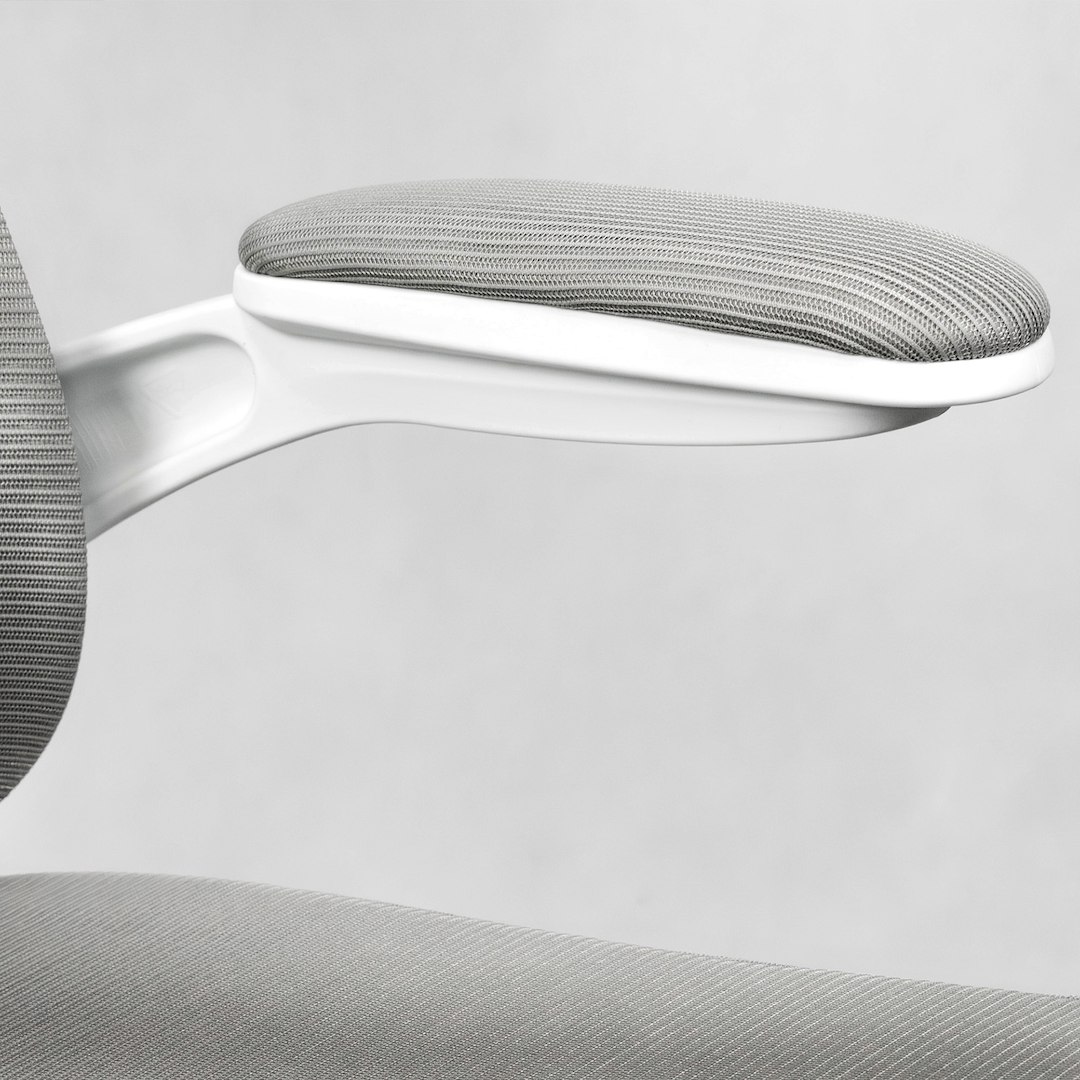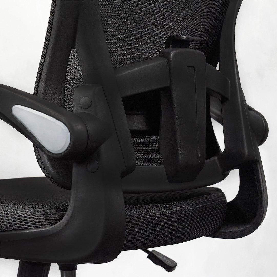 Obite przewiewną tkaniną podłokietniki zapewniają wygodne podparcie rąk. Możesz je również złożyć, aby bez problemu podsunąć się bliżej biurka.