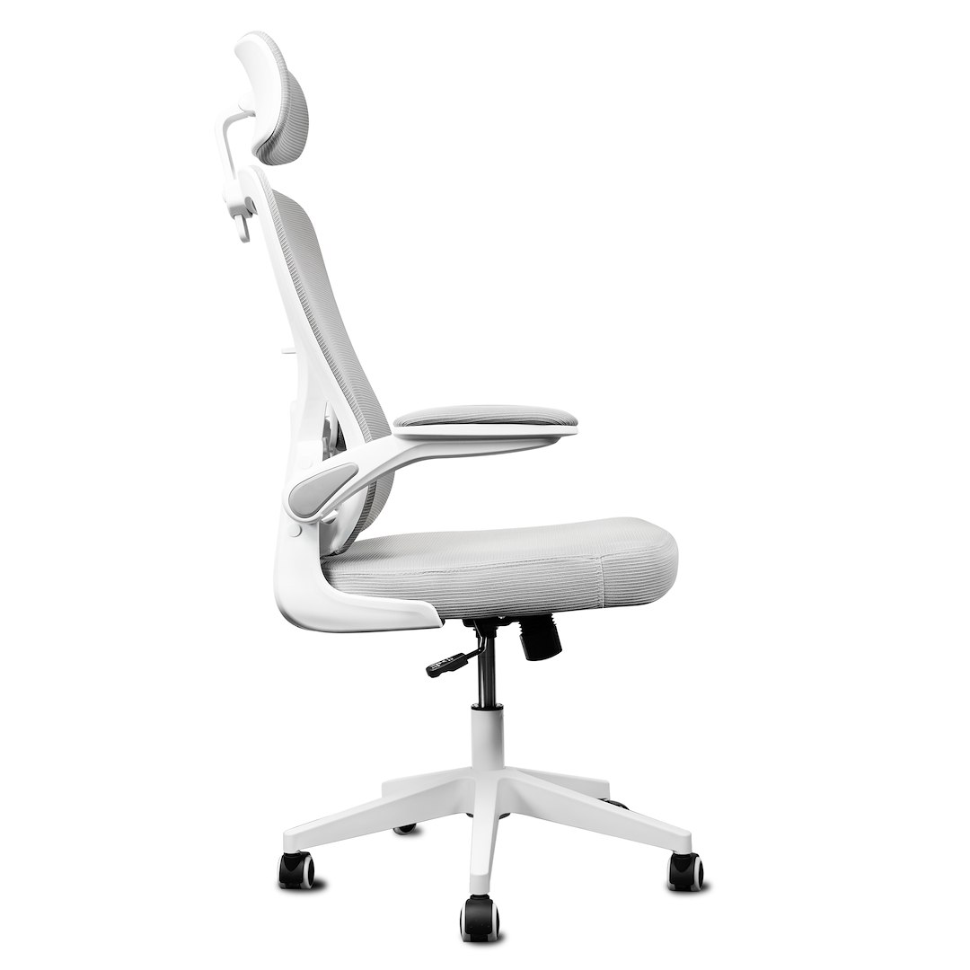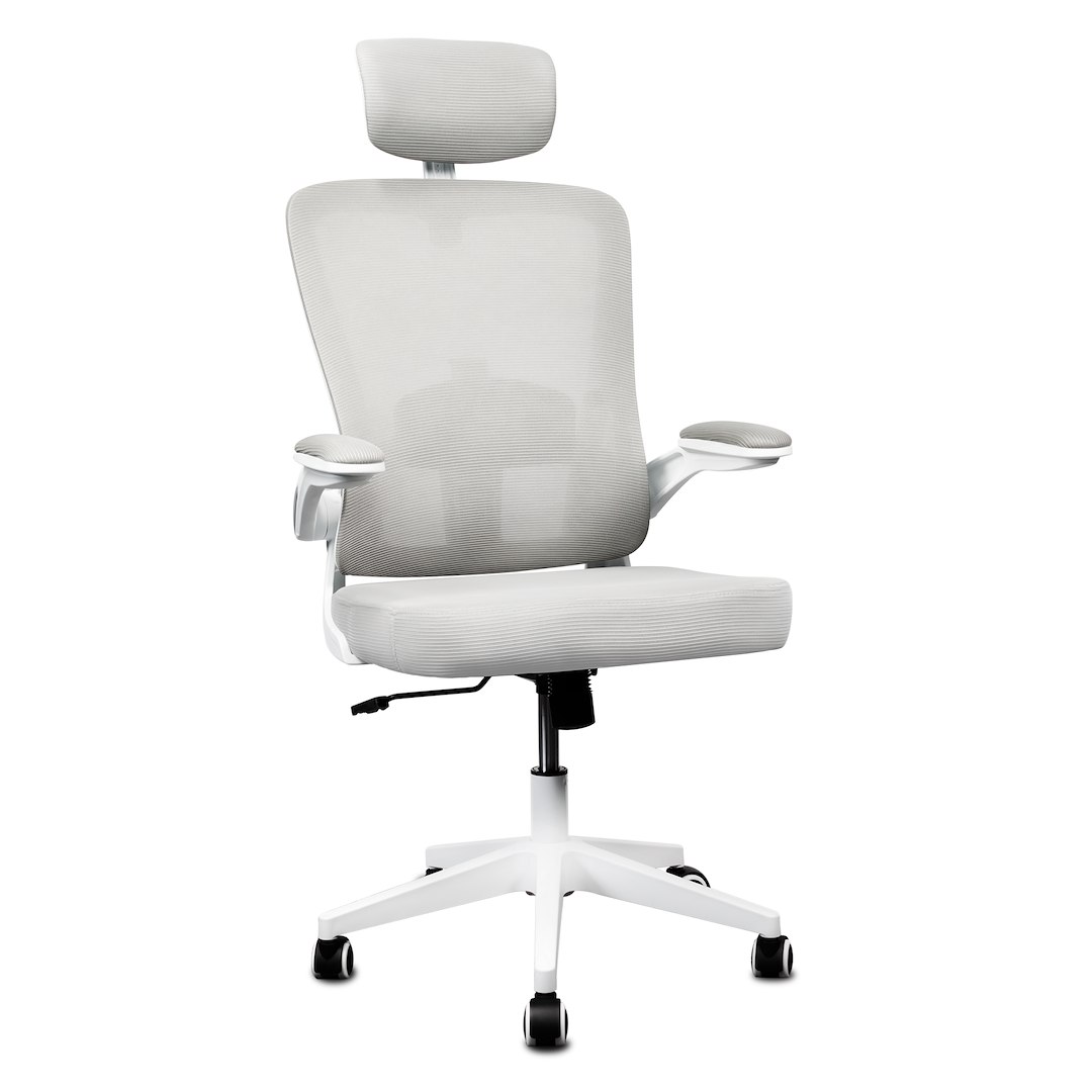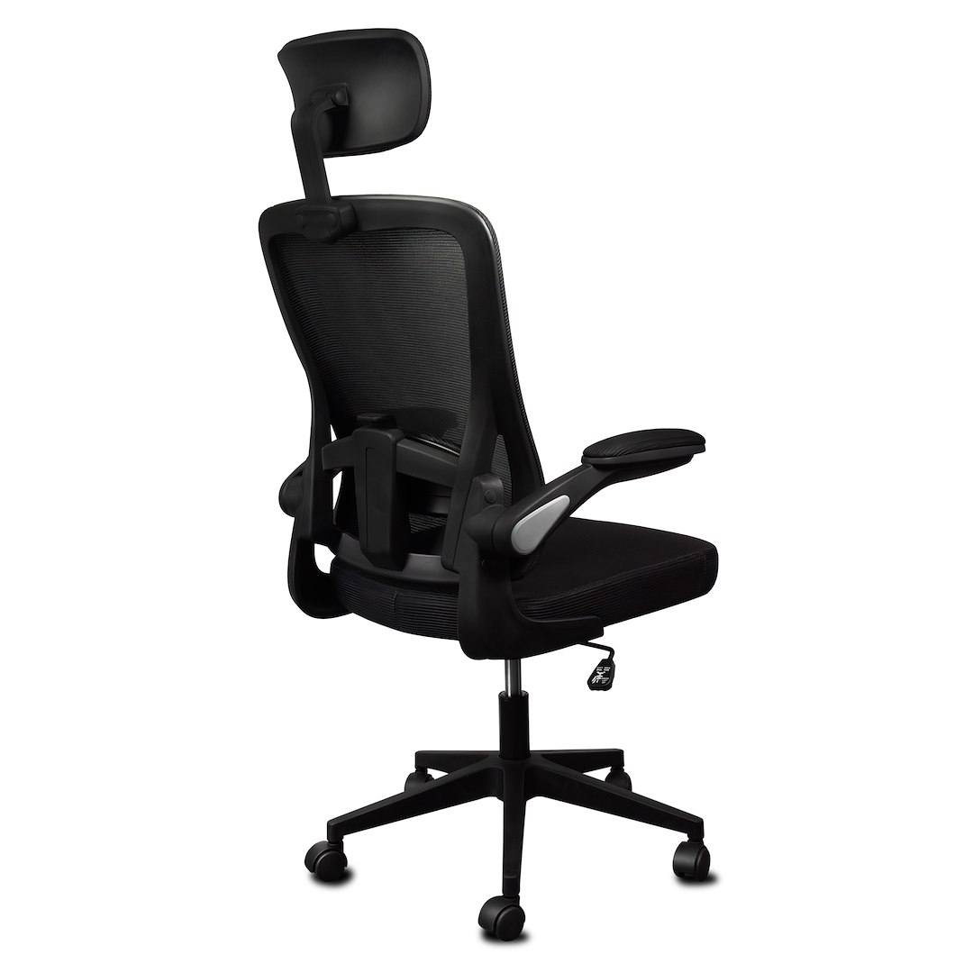Obite przewiewną tkaniną podłokietniki zapewniają wygodne podparcie rąk. Możesz je również złożyć, aby bez problemu podsunąć się bliżej biurka.