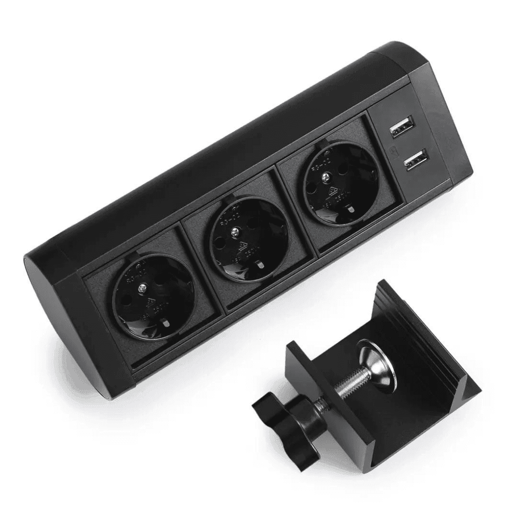 Gniazdo nablatowe narożne – zawiera 3 gniazda elektryczne Schuko oraz podwójną ładowarkę USB. Kabel zasilający o dł. 1,5 m. W kolorze czarnym. Montaż zaciskowy.