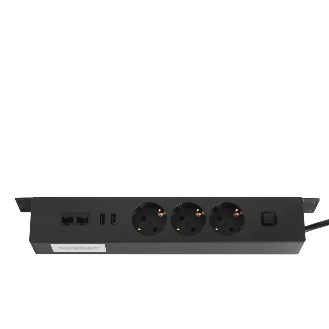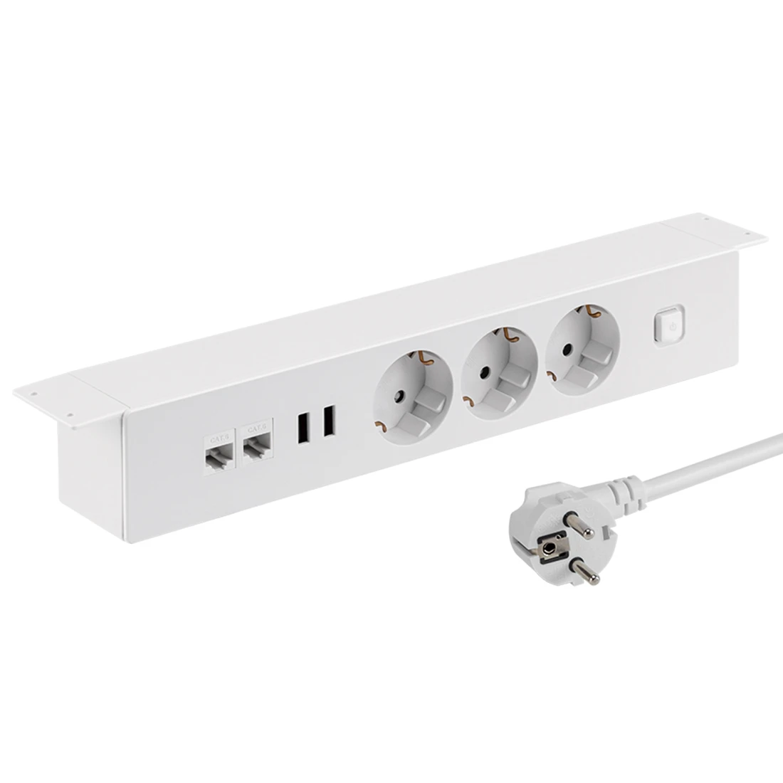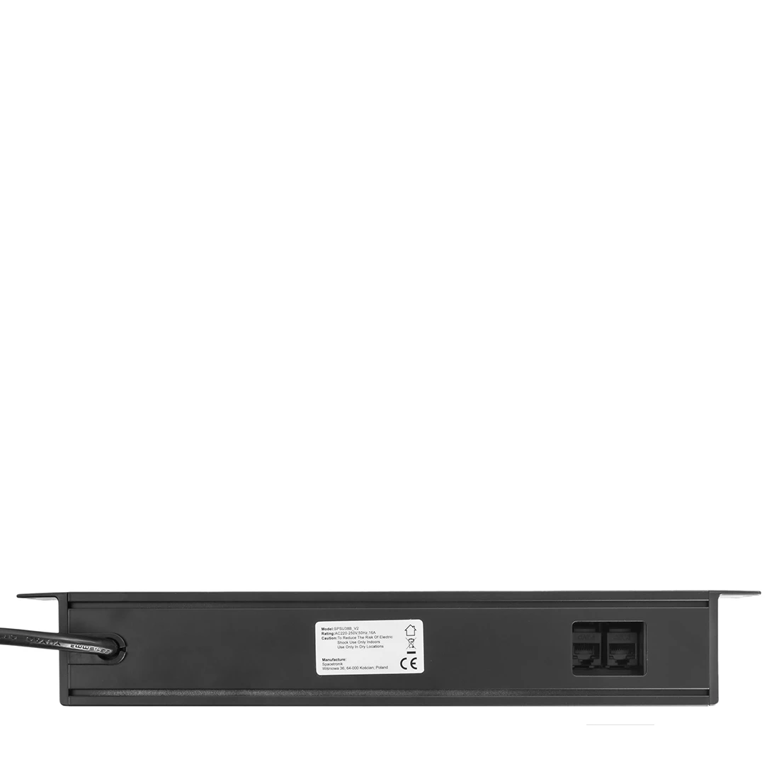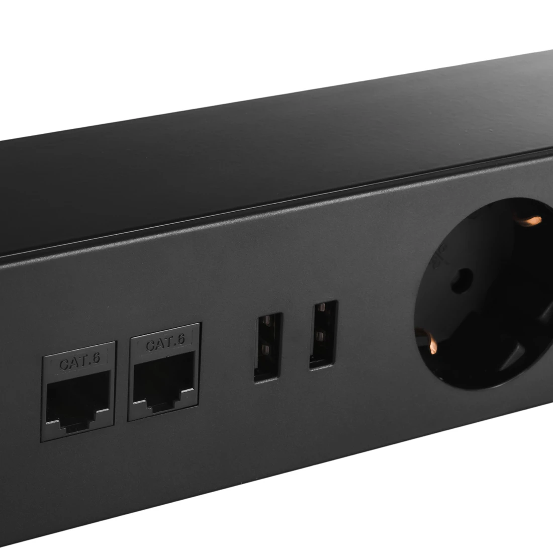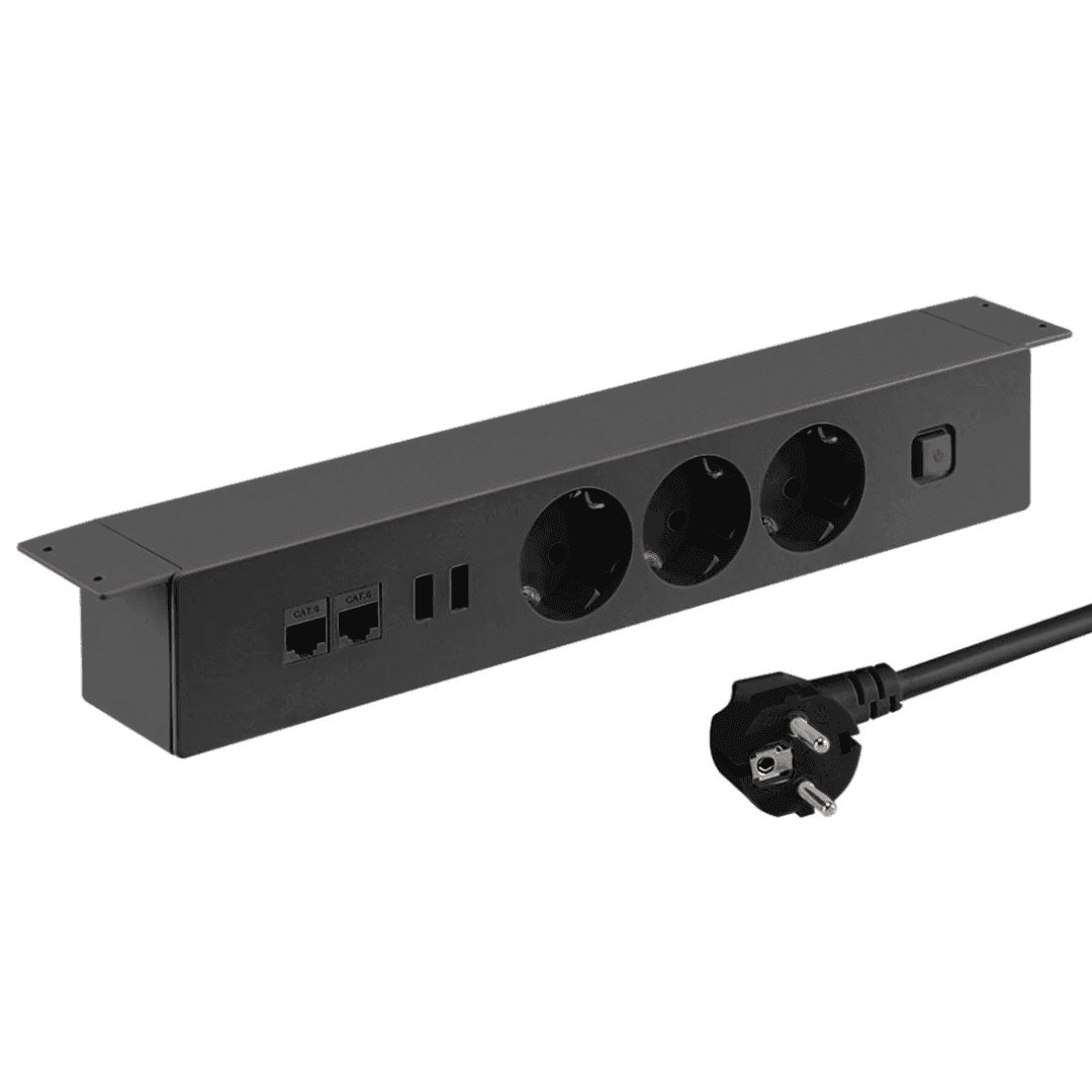 Listwa zasilająca podblatowa. Posiada trzy gniazda elektryczne (Schuko), podwójną ładowarkę USB, dwa keystony RJ-45 oraz włącznik. W kolorze czarnym oraz białym –