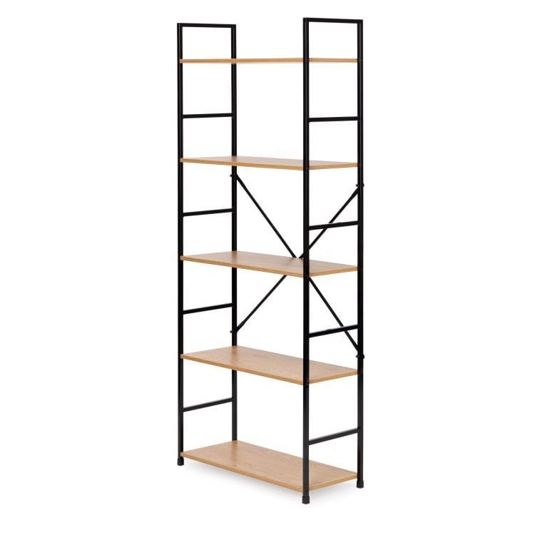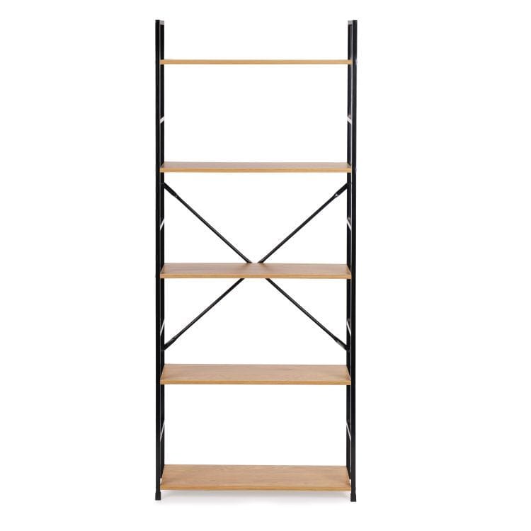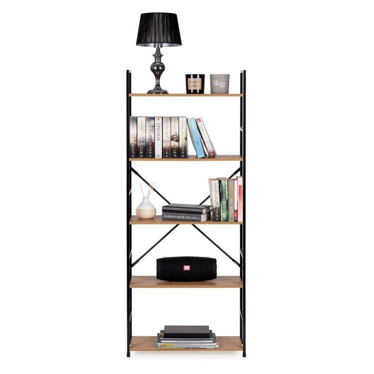 Regał drewniany to nowoczesny mebel o prostym, loftowym designie, który doskonale sprawdzi się w różnych wnętrzach, takich jak sypialnia, salon, przedpokój czy łazienka. Wyposażony w pięć praktycznych półek wykonanych z płyty MDF pokrytej okleiną imitującą drewno, regał charakteryzuje się stabilną konstrukcją z metalowym stelażem malowanym proszkowo. Nogi zakończone są stopkami ochronnymi, które zapobiegają zarysowaniom podłogi.