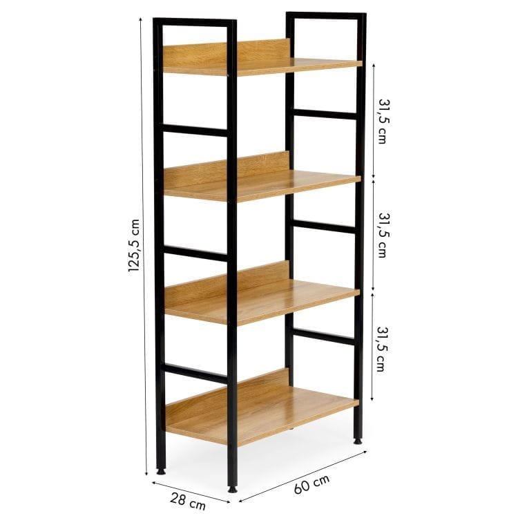 Nowoczesny regał o wymiarach 125,5x60x28 cm. Pojemne, praktyczne półki wykonane zostały z płyty MDF pokrytej laminatem imitującym wzór drewna. Mebel posiada nogi zakończone stopkami ochronnymi chroniącymi podłogę przed zarysowaniami. Stabilna i funkcjonalna konstrukcja idealnie wypełni wnętrze sypialni, salonu, biura czy łazienki.