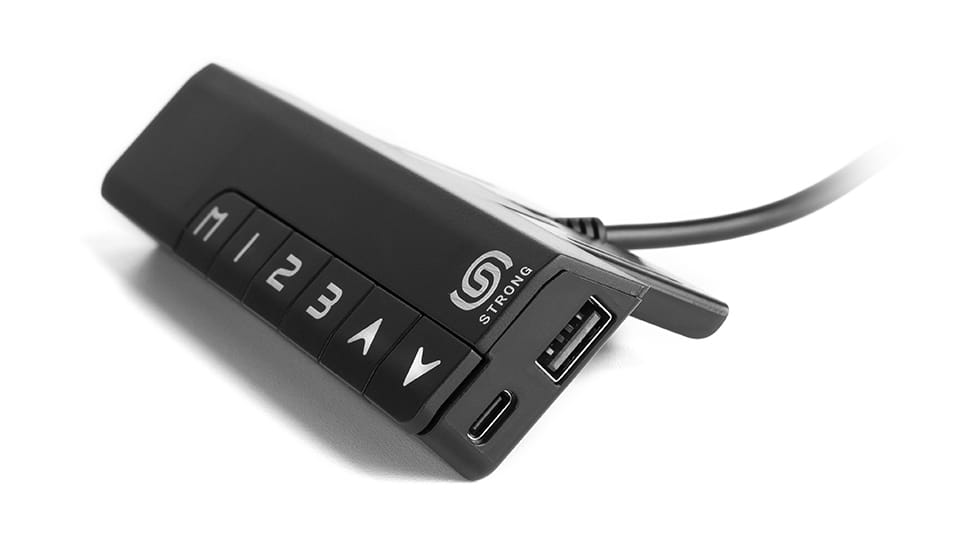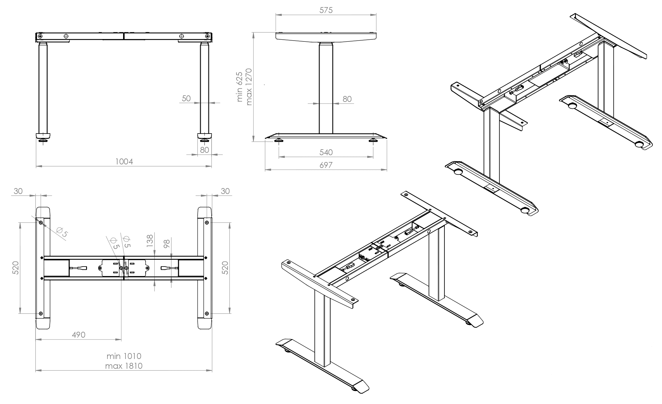 Komplet zawiera 2 nogi (3-segmentowe, profil 80 x 50 mm, 2 silniki), kontroler pamięci – 3 pamięci + 1 x USB A/C, cyfrowy wskaźnik wysokości, przyciski góra / dół