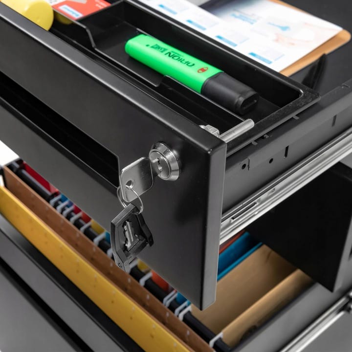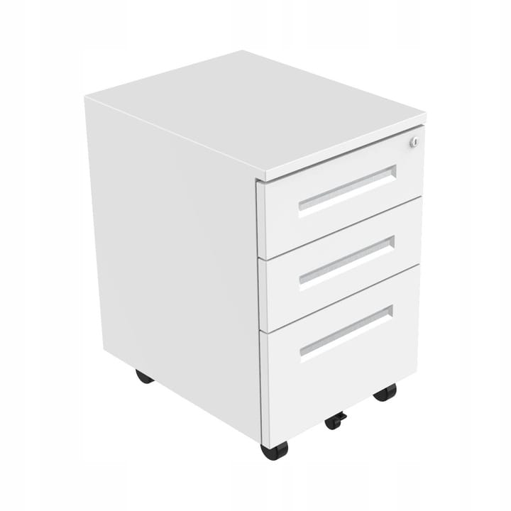 Schludna, dobrze zorganizowana przestrzeń w biurze to absolutna konieczność. Mobilny kontenerek pod biurko to idealne rozwiązanie do przechowywania dokumentów i artykułów biurowych. Wszystko, co potrzebujesz, masz pod ręką. Idealnie nadaje się zarówno do domowego biura, jak i firmy. Szafka jest wykonana z najwyższej stali malowanej proszkowo, co przekłada się na wyjątkową wytrzymałość i stabilność – rozwiązanie na lata. Prosty, nowoczesny design sprawia, że szafka doskonale pasuje do każdego wnętrza. Centralny zamek to gwarancja bezpieczeństwa. Przechowuj dokumenty i wartościowe przedmioty w jednej z zamkniętych szuflad. Dzięki zintegrowanym kółkom można ją w łatwy sposób przemieszczać. Szafka jest prawie gotowa do użycia, wystarczy, że zamonutujesz kółka (nie potrzebujesz do tego żadnych narzędzi).