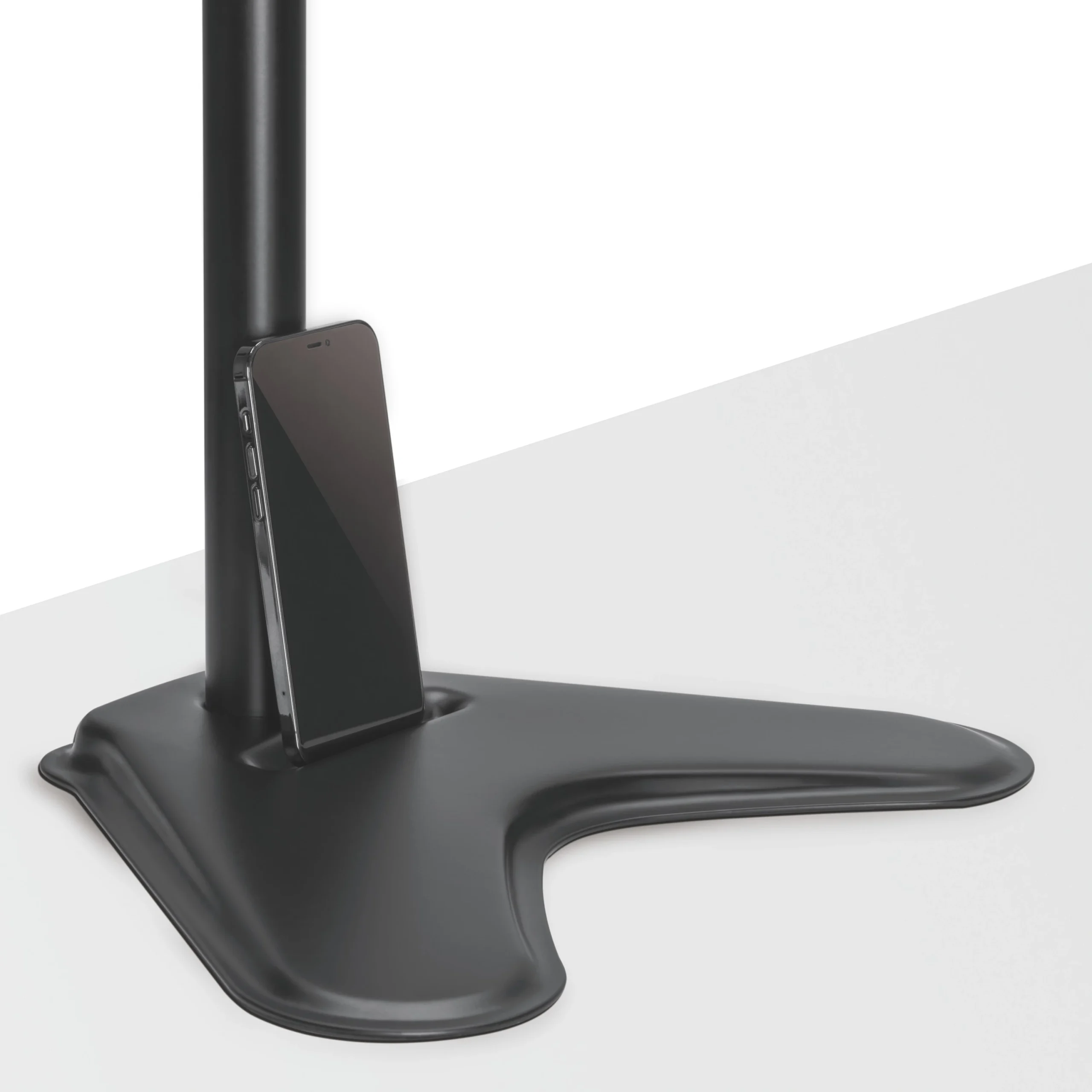 Uchwyt wolnostojący na podstawie z miejscem na telefon komórkowy.