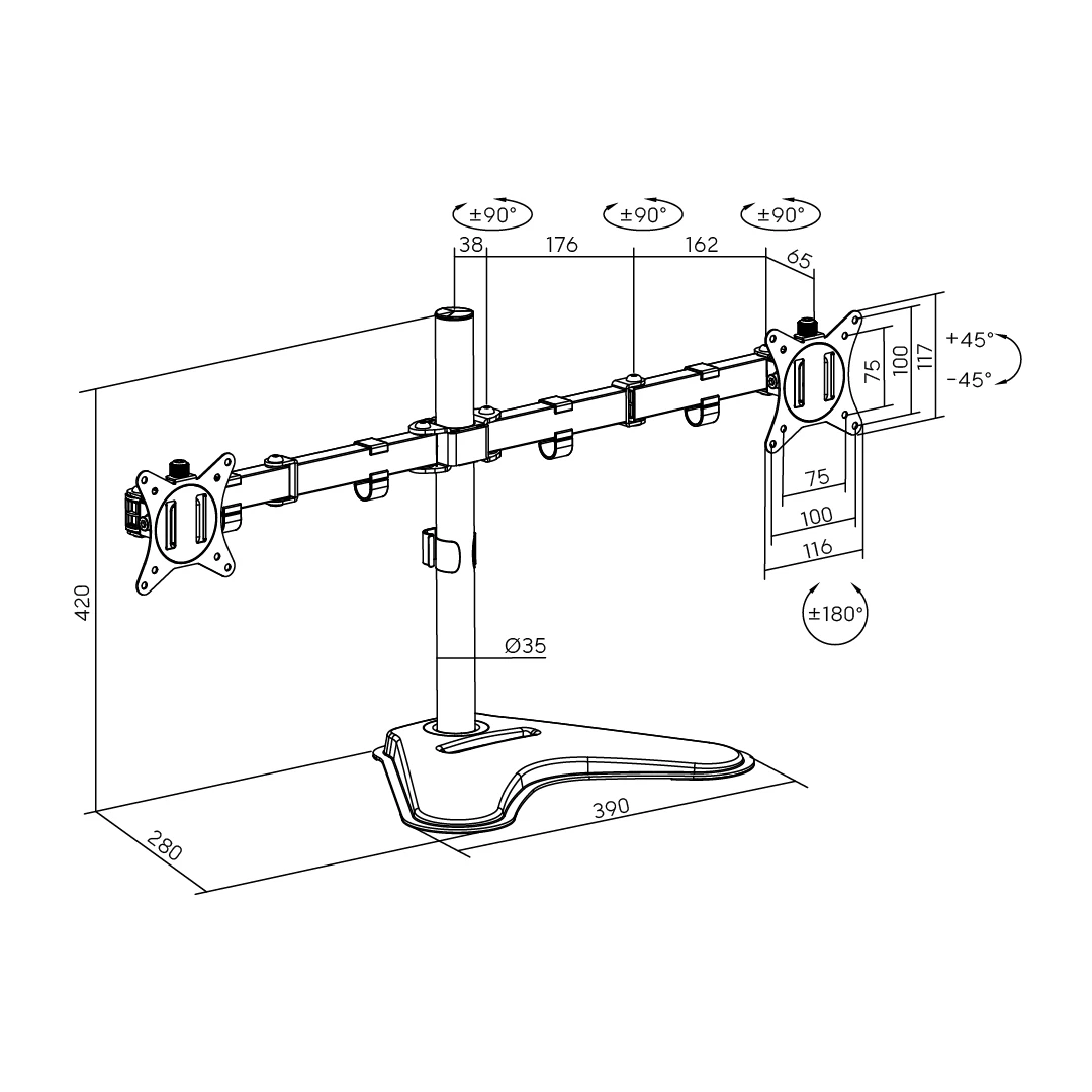 Konstrukcja o szerokim zakresie zapewniająca dużą regulację i kąty widzenia, możliwość ustawienia w orientacji pionowej lub poziomej.